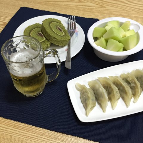 혼술 - 녹차롤, 메론, 찐만두, 맥주