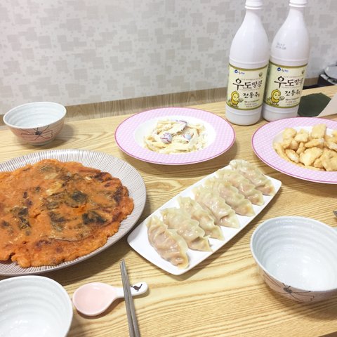 유일하게 다른 사람이랑 같이 마신 술상 - 김치전, 찐만두, 우도 땅콩막걸리