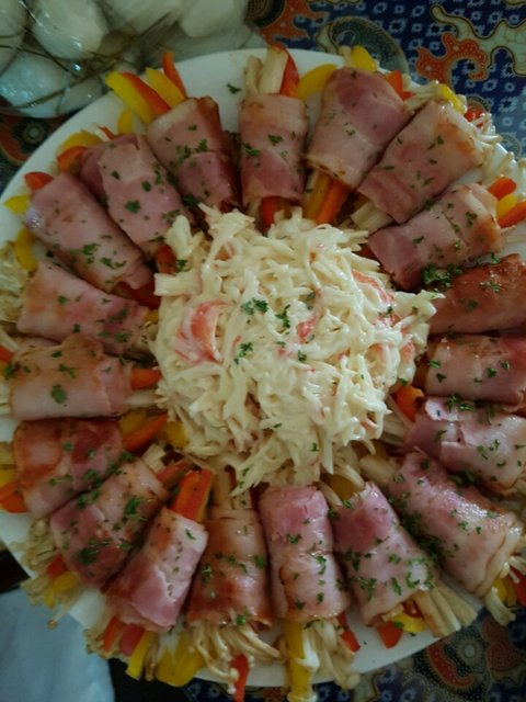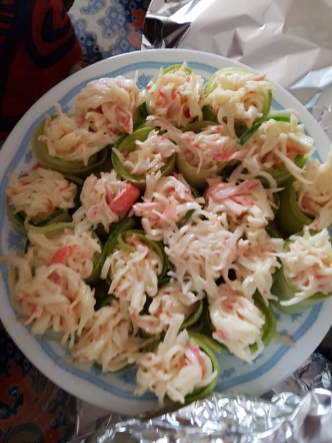 먼저 오이를 감자칼로 잘라 체에 받쳐 두고 물 뺏어요.크래미 잘게 찢어~마요네즈 허니 머스터드 아가베 시럽 후추넣어 만든 소스에 버무려 또로록 말기!