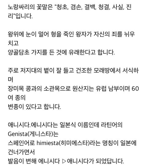 박애랑 겸손 둘 다 맞을 걸? 우리말로 양골담초 노랑싸리 향기싸리임 금작화는 한자어