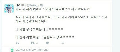 리리에타 라고 로1리콘이 16살 중학생한데 섹0하자,아래(하체)도 보여달라,결혼하자 이러면서 성희롱 한거 들통났는데 트위터하는 판녀들 빨리 리리에타 신고/블락(차단)해줬으면 해서 글 올려
