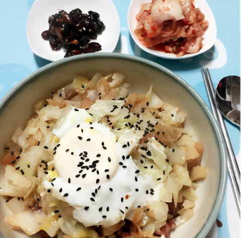 집에 양배추가 잔뜩있어서 해치우려고 만든... 굳이 이름을 붙이자면 양배추된장덮밥? 이에요. 된장+물을 풀어서 식용유에 볶은 양배추에 넣고 자박자박 조린다음에 위에 계란넣고 뚜껑 덮은다음에 계란이 익을때까지만 익혀요. 밥위에 참기름+간장약간넣고 비벼먹으니까 건강한 한끼식사가 되더라구요. ^^