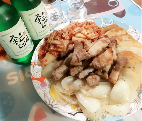 드디어 술이 나왔네요ㅋㅋㅋㅋㅋ 저희끼리는 "삼겹살한판" 이라고 불러요ㅋㅋㅋ 구우면서 먹으면 물론 훨씬 맛있지만 치울것도 많아지고 기름튀는게 싫어서ㅜㅜ 가스레인지에서 한번에 구워서 식탁으로 옮기면 근사한 안주로 변신♥️ 삼겹살+감자+양파+김치의 환상조합