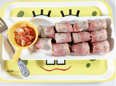 이건 베이컨초밥이에요. 밥은 김밥할때처럼 소금약간이랑 참기름으로 간 해주시구 그위에 베이컨으로 돌돌 말아서주면 진짜 좋아해요! 간단하기도 하지만 저희아들이 참 좋아해요^^