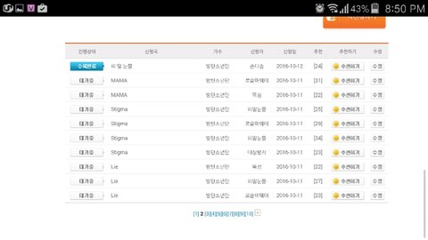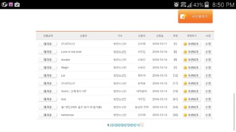노래신청을 누르면돼 그리고 가수명을 방탄소년단으로 검색한다음 맨 밑으로 스크롤을 내리면 수록 안 된 곡들이 나올거야 밑에처럼