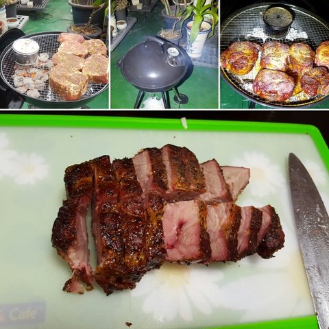 이건 옥상 화로에서 해먹은 훈연 목살구이에요. 살코기가 빨갛게 안익어보이는데 훈연이 스며들어서 색깔이 그런거지 다 익은거에요 ㅎㅎ
