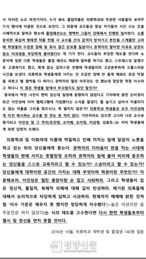 최순실 딸과 같은 수업 들은 학생, 담당 교수 사과 요구