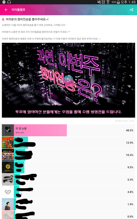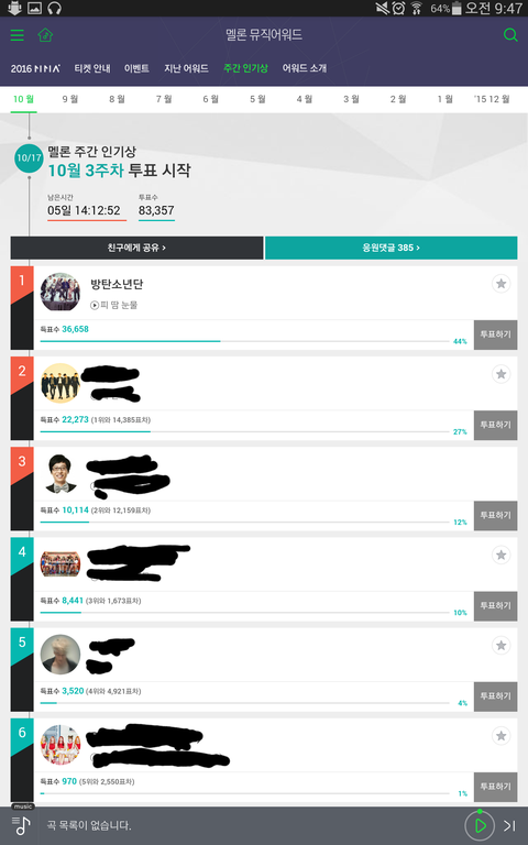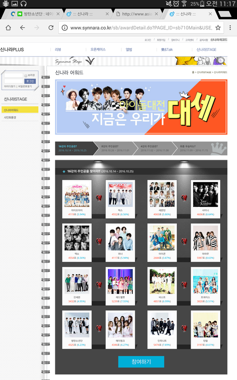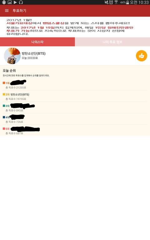 지금 1위랑 얼마차이안나니까 힘내서 하루에 매일 5표씩은 꼭 투표!