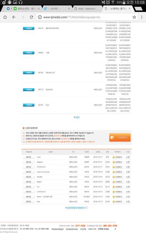 노래신청 - 가수명 : 방탄소년단 - 맨밑에 수록안된 곡 추천하기 누르기