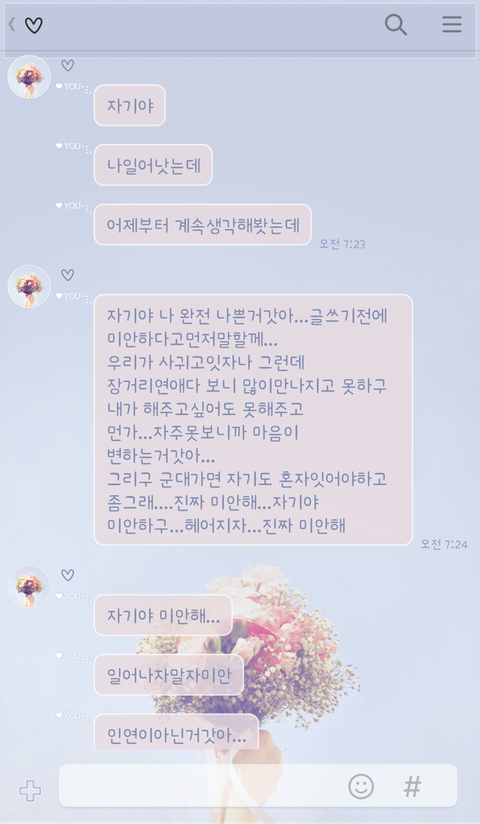 제가 자꾸 현실을 회피하는걸수도 있는데 입대때문에 일부러 마음떠났다는 마음에도 없는말을 해서 밀어낸건 아닐까싶어요
