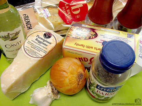 재료는 양파와 버터 약간, 마늘, 파슬리, 후추, 소금, 화이트와인, 치즈, 그리고 먹다 남아서 딱딱해진 바게트빵입니다.