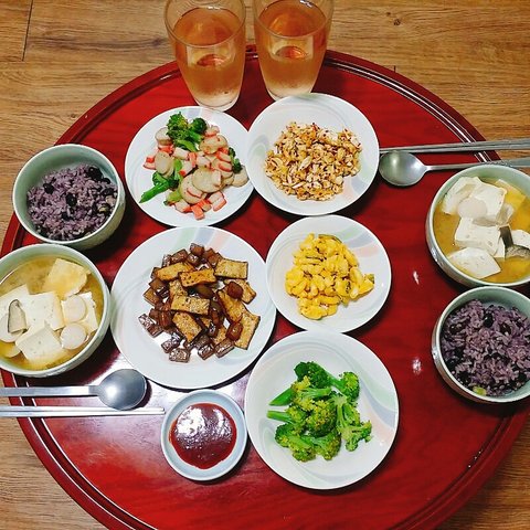 흑미콩밥&버섯두부된장국&버섯맛살브로콜리볶음&곤약어묵볶음&양배추무침&단호박마카로니샐러드&브로콜리