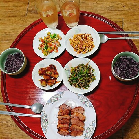 흑미밥&애호박맛살볶음&돈가스&양배추무침&돌나물&훈제오리