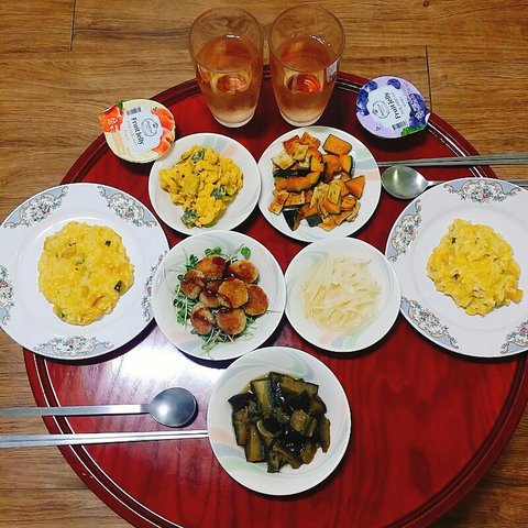 단호박리소토&단호박마카로니샐러드&새싹 돈가스&가지나물&단호박어묵볶음&무나물