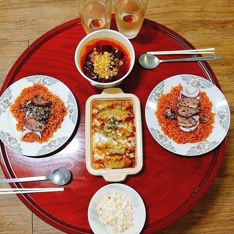 오리 불닭 볶음면&매운순대&왕교자그라탕&옥수수샐러드
