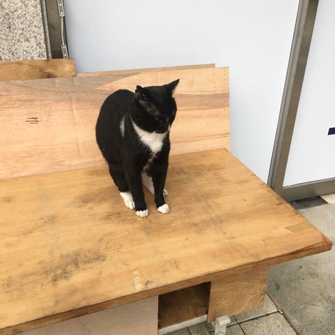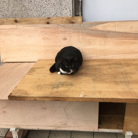 어제 아침에 나무로 만든 고양이 집 위에 그 고양이가 앉아있길래 점점 가까이 천천히 다가갔어요.