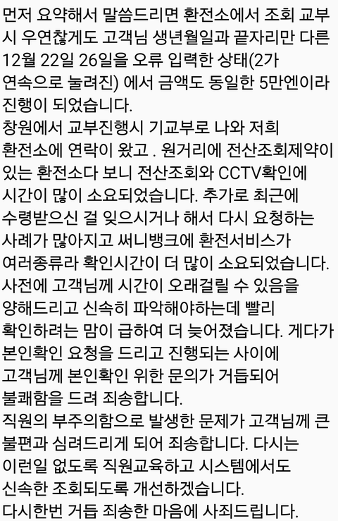 직원이 아파서 실수로 똑같은 5만엔에 생년월일 뒤에 한자리가 저랑다른 사람에게 돈을 지급했다라고 하였습니다 그러며러 또 죄송하다구..