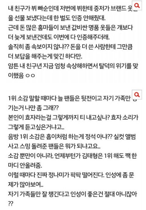 ㅅㅂㅋㅋㅋ불타때 이후로 지금 첫 1윈데 안올려줬대 날조지리고~조공얘긴 구란거 당연히 알지? 태형이 일반팬들 브랜드아닌옷도 인증해줌 ㅉㅉ
