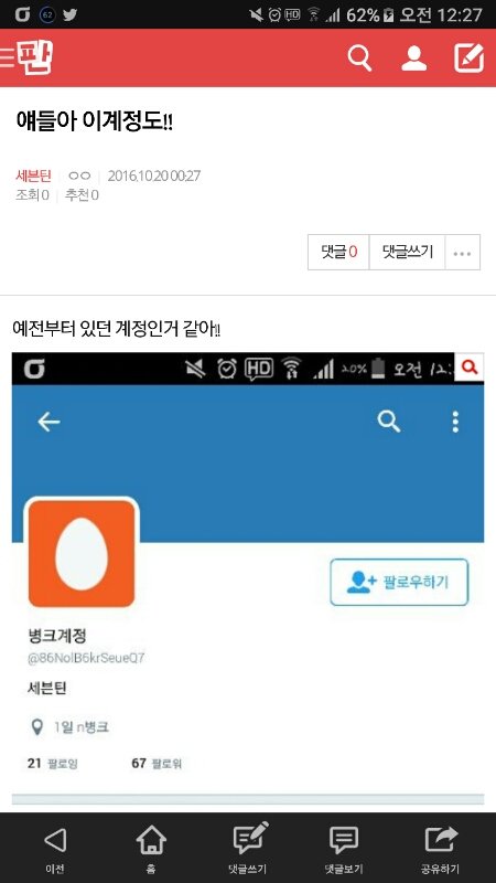 알계캐럿이 내 계정을 보여주길래ㅋㅋㅋㅋ ㅇ저 계정 주인이야 별건 없고 그냥 혼잣말 하며 오해를 풀려는 계정이니까 혹시 여기서 짹한다면 저기 있는 팬톡에 관한 글좀 알티 해 줬으면 좋겠다. 나는 내부분열 진심으로 원치 않거든ㅋㅋ