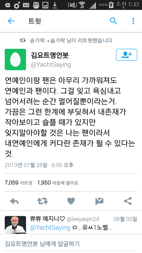 우리 애들처럼 매 순간순간 팬들 챙겨주는 애들 없지. 그게 왜라고 생각해? 난 애들이 우승한소감, 상 탄 소감 말할때 부모님 얘기는 꼭 빠지지않고 하는게 그렇게 에쁘고 자랑스러울 수가 없어. 좀 생각을 해봐.