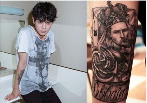 오른쪽 팔뚝에 있는 타투는 킹카드 문양의 '커트코베인'