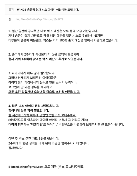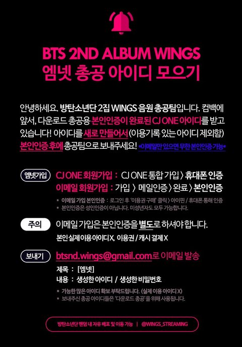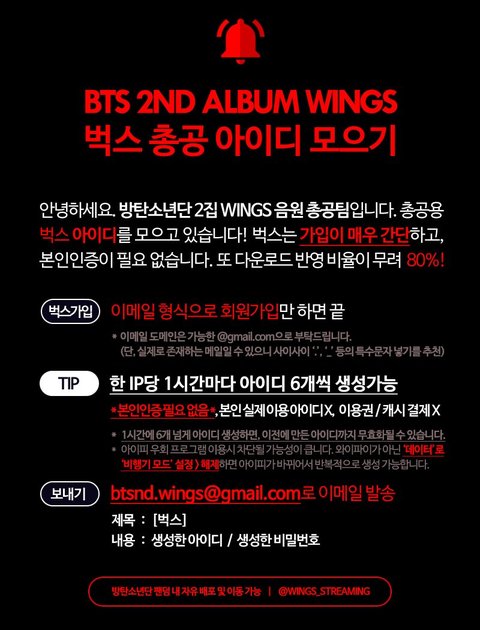 예를들어 아이디 : sky1_2_@naver.com / 비번 : sky12345 이런식으로 만들어내서 회원가입한다음 btsnd.wings@gmail.com 로 보내면돼!!