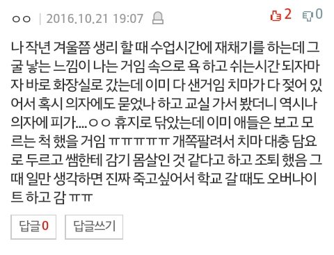 모르는척 하면서 속으로 괜찮아 생리대가 지켜줄거야 뭐 이런생각 하는도중 의자에 앉을려고 했더니 의자를 뺌..ㅋ 2차 줄줄 솔까 생리 흐르는거 약간 좀 찝찝하고 뭔가 기분 이상하잖아 그래도 괜찮은척 스르륵 일어났는데 분무기로 물 조카 뿌려댐ㅋ 솔직히 친구들이 잘못한건 없는데 걍 나 혼자 빡쳐서 아 ㅅㅂ!!! 이러고 반 나옴 친구들 다 벙쪄있음.. 사실 나 생리대 갈려고 간거임..ㅋ 근데 친구들은 모름 애들이 막 졸졸 쫒아옴 좀 그때 짜증