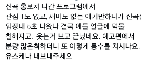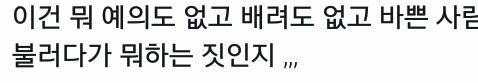 예고를 그딴식으로 하지를 말던가..... 아니 그냥 모든 부분이 다 빡쳤어. 무슨 08년도 데뷔초 예능 보는 줄; 작가 일 안하는 거 너무 티났고.... 질문 수준도 너무 저급했고.