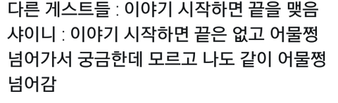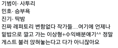 조카 재밌었는데. 그냥 빠순이들은 지들 오빠들 분량 부족해서 _같았던것 뿐이지 일반 시청자로써는 그냥 꿀잼이였는데?ㅋ