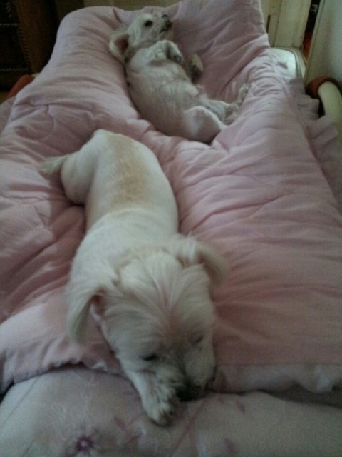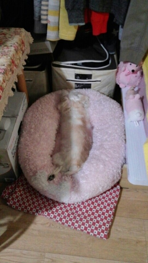 전반적으로 흰 털인데 척추뼈를 따라 등에 누런 털이 조금 보입니다.