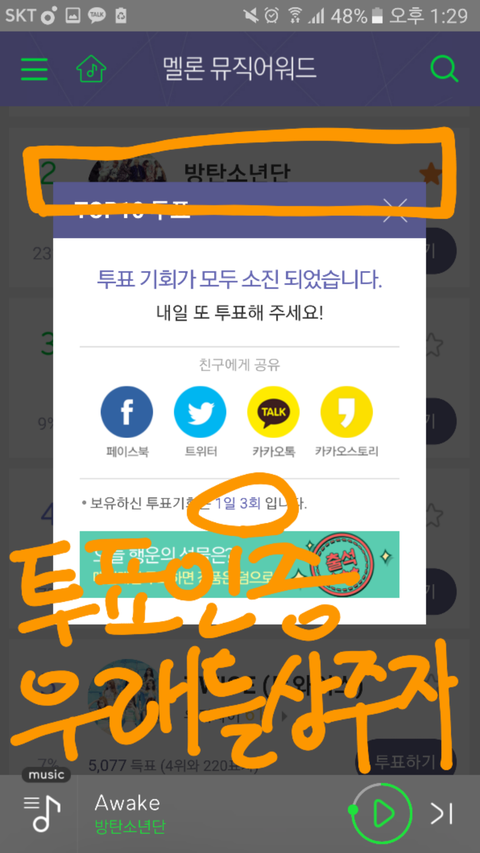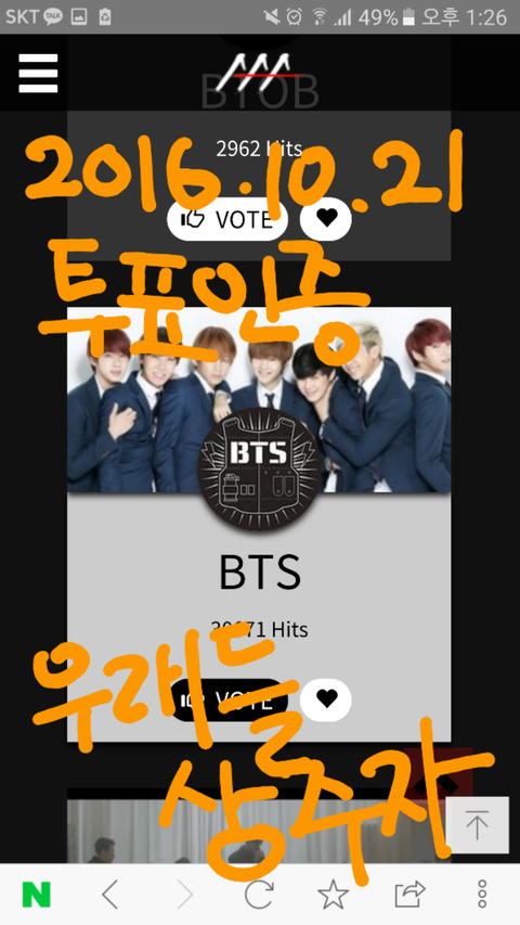 네이버나 페북 아이디로 로그인하고 B라인으로 내려가면 방탄이들 잇음!! 열심히스밍스밍하고 있겟지? 투표도 열심히 하자...! 신기록 세웠다 최초다 매일 칭찬 일색인데 큰 상 하나 꼭 손에 쥐어주자ㅠ