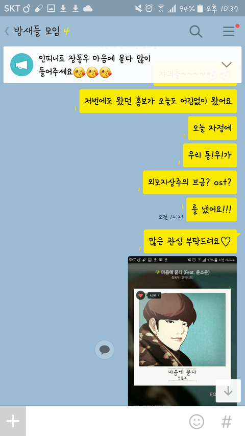 초6때 인피니트 덕질을 시작한 이후 단한번도 일코를 해본 적이 없다...☆ 자기소개할때도 난 인피니트를 좋이해^^이러구 체육대회 때 반티 이름도 끄덕끄덕나올 때라서 남우현적구......ㅎ...... 인피니트 관련된 건 다 홍보함...