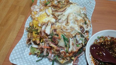오징어랑 파랑 각종채소들이 붙으라고 버무린다음 오로지 계란으로만 전을 부친 오징어 파전과