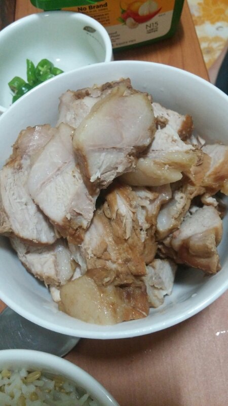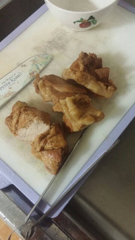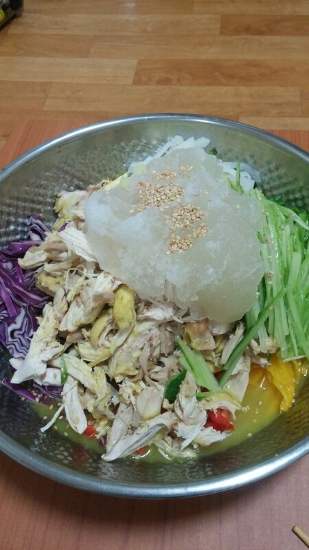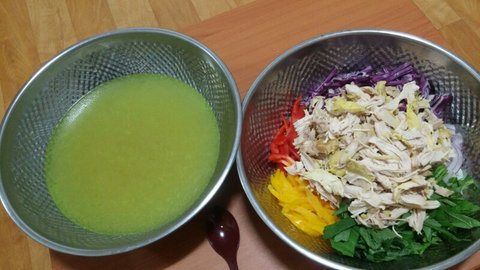 냉장고에 처박아둔 파프리카가 서서히 생기가 없어 가길래 닭한마리 사다가 푹 고와서 살 발라서 찢어놓고 육수는 따로 식혀서 기름 걷어내고 겨자소스 만들어놓고 닭육수 얼려논거랑 희석해서 시원하고 톡톡 쏘고 매콤하고 달콤 짭쪼름한 초계탕(^-^)v