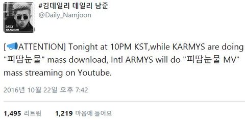 -한국시간으로 오늘 밤 10시에 한국 아미들이 피땀눈물 다운로드 총공을 하는데