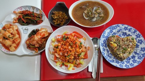 혼자먹는데 참 공 많이 들이죠? ㅋㅋ 굴소스채소볶음밥과 혼자 창작해본 토마토계란볶음샐러드예요. 그냥 레시피 따로 없이 삘받는대루 만들어서 먹어봐요. 이것도 맛있었네요. 음식 is 뭔들... ㅋㅋ 바지락된장국까지 끓여서 야무지게 클리어~