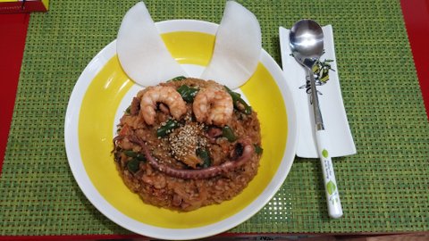 굴소스해물볶음밥인데 심심해서 대하랑 낙지다리로 데코 한번 해봤어요. 무쌈으로 귀를 한건 NG..ㅋㅋ 귀가 너무 커서 그릇밖으로 튀어나가심..ㅋㅋ