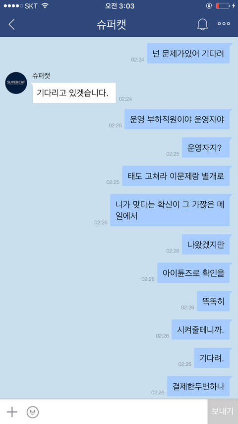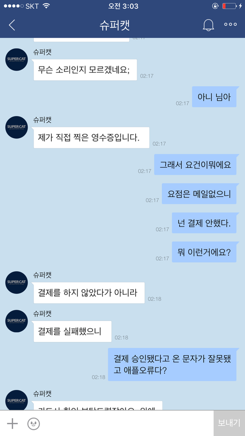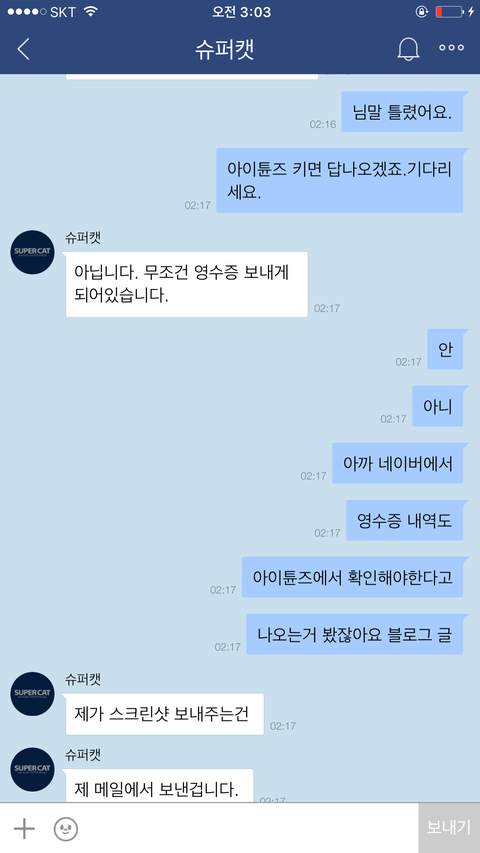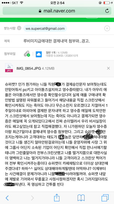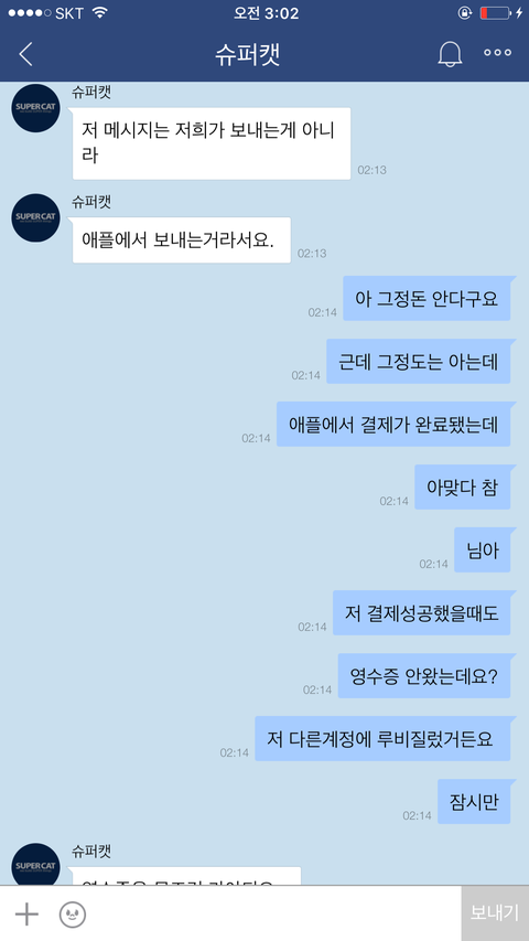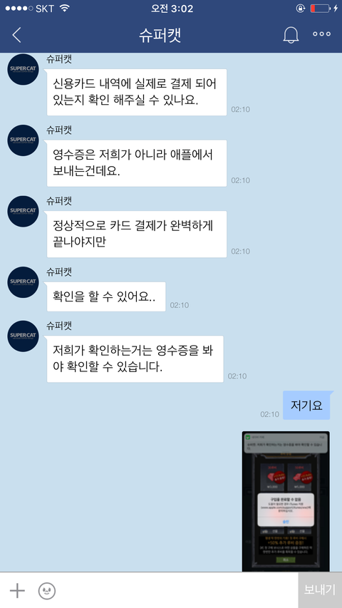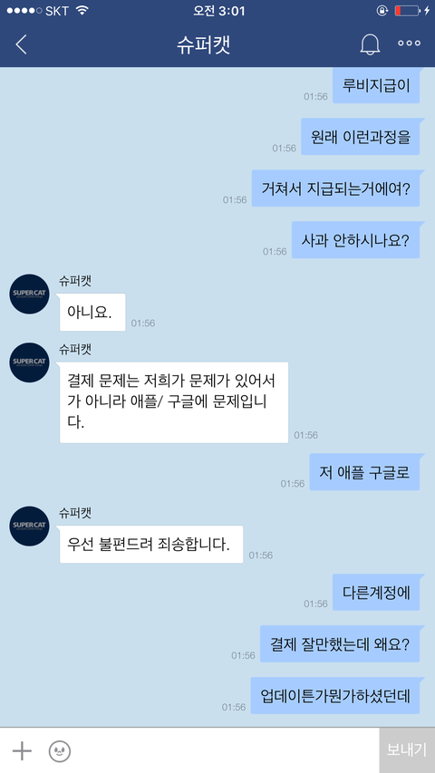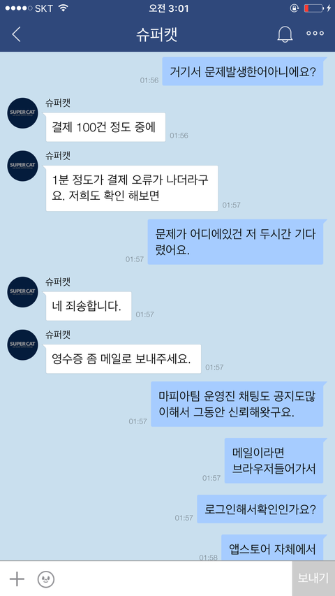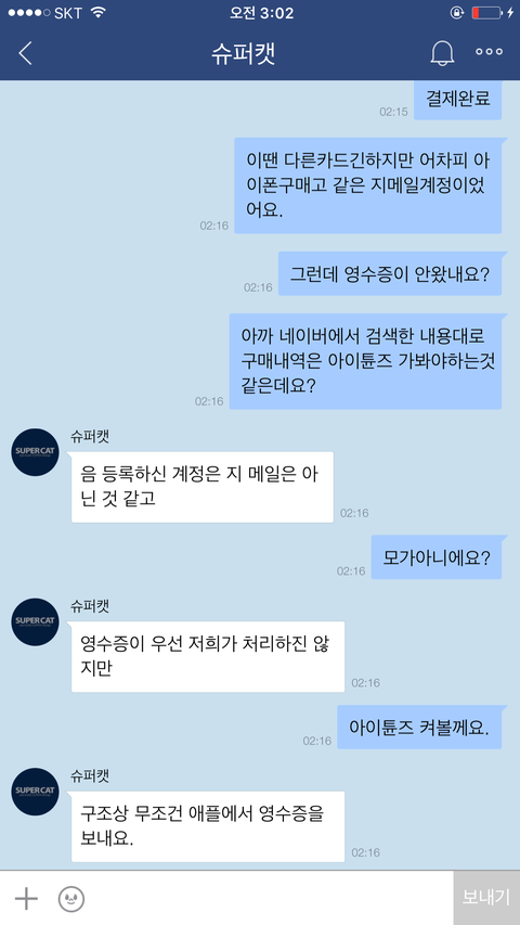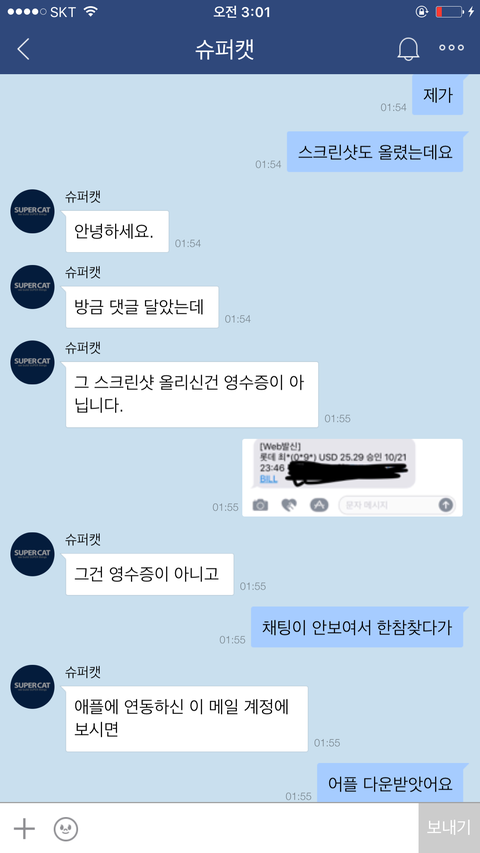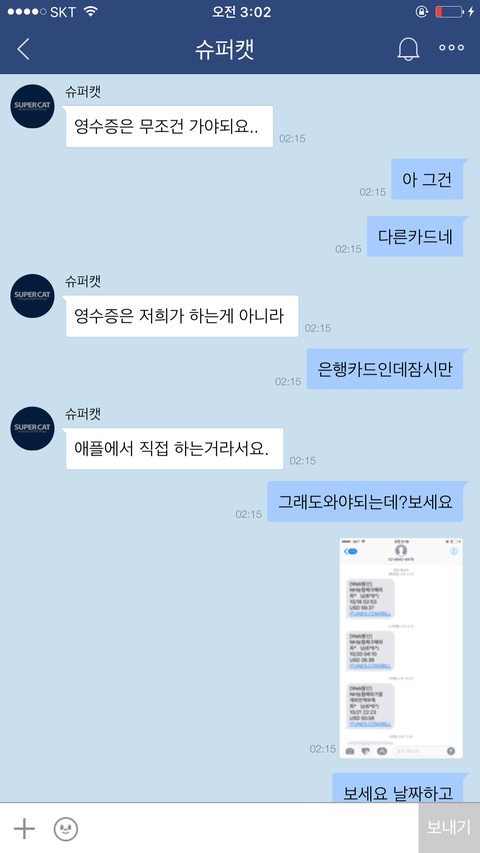 아니......ㅋ애플이 영수증을 그런식으로 하는걸 제가 어떻게 할수는 없는일이기에 저는 애플은 아이튠즈로만 영수증을 확인할수있다고 말했어요.아무리 말해봤지만 포켓마피아 운영진은 떄려죽여도 이메일내 영수증이 있을거라며 알아보지도않고 무슨믿음에가득찬것인지 끝끝내 같은것을 요구하더라구요. 저는 아이튠즈내 영수증을 스크린샷해서 어플관리자이름,구입품목,시간,날짜,지불가격등이 적힌 영수증을 확인시켰지만 결과는 같았습니다. 이메일내 첨부된 영수증을 가져오라는것이죠..아니 도대체 업체의 운영자겸 관리자라는 사람이 어떻게 애플은 이메일로 영수증을 발급하지 않는다는 사실을 모를수가있나 싶기도했지만 백번양보해서 모를수있다고 봐주더라도 모르면 알아봐서라도 고객문제를 응대해야하는게 고객상담의 위치아니겠습니까..?그런데도 1분만에 칼답 꼬박꼬박하면서 하는말은 모조리 그럴리없다 무슨말인지모르겠다 영수증을가져와라 틀렸다 안된다.......애플탓까지하더군요 애플의 실수라는데 아이튠즈 스크린샷 첨부한거 보시면 아시겠지만 애플에서는 이미 정상 결제승인처리되었고 문자에도 '승인'이라고 표기되었고,아이튠즈에도 정상결제 처리되있는 것을 확인할수있는데 자기들 전산오류인건 확인해보지도않고 무조건 애플탓 애플탓 하더라고요..................아니 제가 무슨 애플 빠돌이는 아니지만(모니터삼성본체삼성마우스삼성씁니다....폰만아이폰)애플 운영방책이 그렇다는데 영수증만 이메일로 발부하지않는거지 결제자체는 애플에서 승인을마치고 이미 떠나간 후였는데 도대체 왜 애플탓을하면서 이메일에 발부된 영수증을 가져오라고 집착아닌 집착을하면서 고집을부리는건지......저는 너무 답답하고 본인의 지식에 확신에 찬 모습을 굽히지않는 고객상담팀에 매우 화가나 욕설까지 하게되었습니다...............