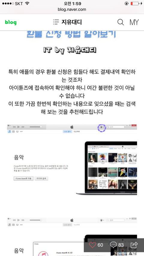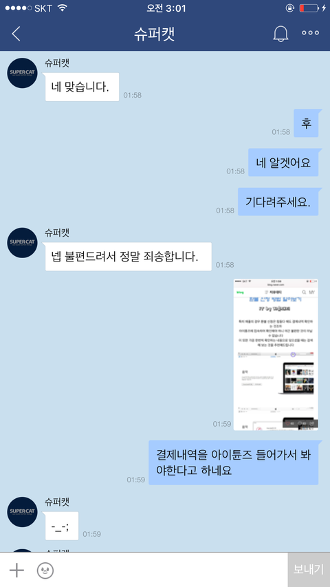 먼저 저는 이를 설명하기위해서 스크린샷도 제공해가면서(애플영수증은 아이튠즈를 들어가야한다는 설명이 게시된 네이X 블로그글을 캡쳐) 아이튠즈(애플의 영수증 제공방침에따르면 아이튠즈내부로 영수증을 제공하게되어있어서 아이튠즈에 구글계정을 로그인해야 영수증을 확인가능함.해당내용 설명된 블로그글 캡쳐파일 참조)내에 들어가서 영수증을 확인시키겠다고 말했죠.