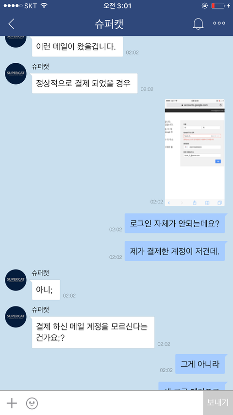 잠깐 렉같은게 걸린거겠지. 그렇게 3시간을 인앱결제한 품목을 기다렸으나 품목이 들어오지않아 1:1문의를 받게되었고..결제를 증명할 영수증을 가져오라는 고객응대를 받게되었습니다.