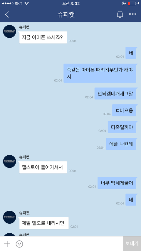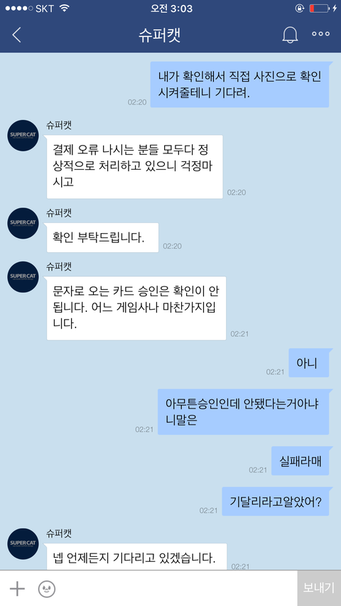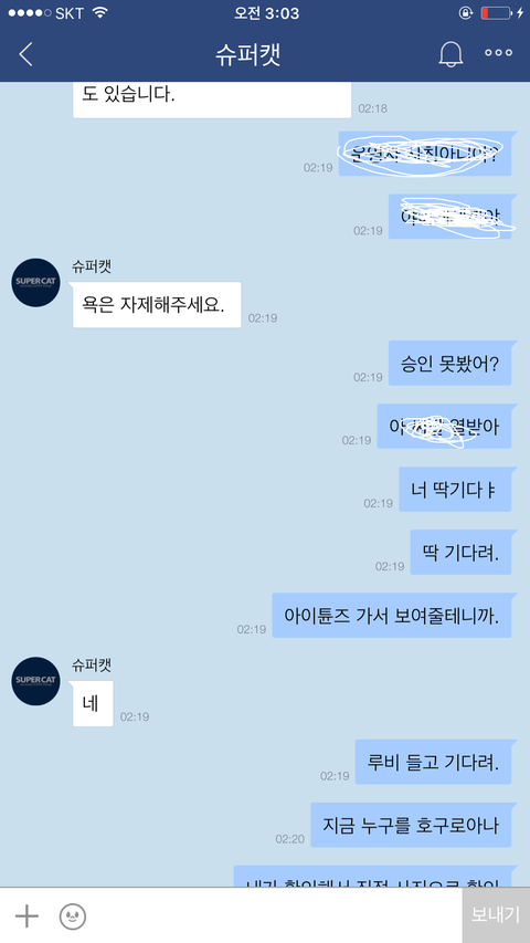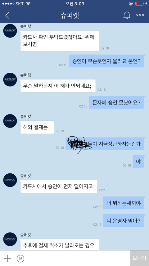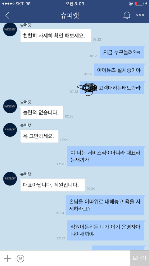저는 카페내부에 슈X캣에게 사과를 요구하는 글들을 올렸고...욕설한것은 잘못이지만 먼저 사과를받기전까지 슈X캣에대한 인식은 사기꾼에불과하다..사과를받기전까지 제 입장은 변함이없는데 무조건 욕했다고 사과하라는 다른유저들에게도 저는 실망을 하지않을수 없었습니다..