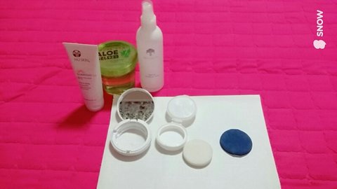 일단 준비물은 스킨, 알로에 젤, 선크림 (난 백탁없는걸루 했엉), 기본 쿠션부품 이 필요하궁