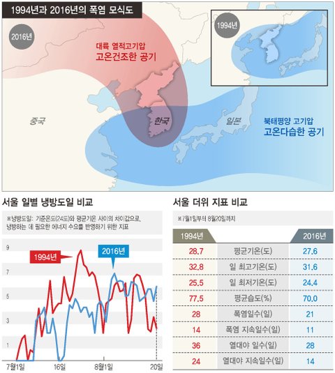 그렇게 단순하게 따지면 94년에 태어난 친구들 보다 올해 태어난 친구들이 더 엄마에게 고마워 해야 ----------- http://pann.nate.com/talk/334212187 ----------- ‘열적 고기압’의 습격, 무더위의 쉼표 마저 지웠다 왜 올해가 94년 보다 덥게 느껴지나 올해 살인적 무더위의 주범은 ‘단골 손님’ 북 태평양 고기압 말고도 중국에서 세를 키운 ‘열적 고기압’ 1994년 폭염 기록은 ‘넘사벽’이지만 올해 더 더운 건 냉방도일 누적 때문 태풍 없는 무더위도 체감지수 높여 뜨거운 공기로 샌드위치 된 한반도 8월 냉방도일 94년 보다 높아 http://www.hani.co.kr/arti/society/environment/757694.html -------------- /