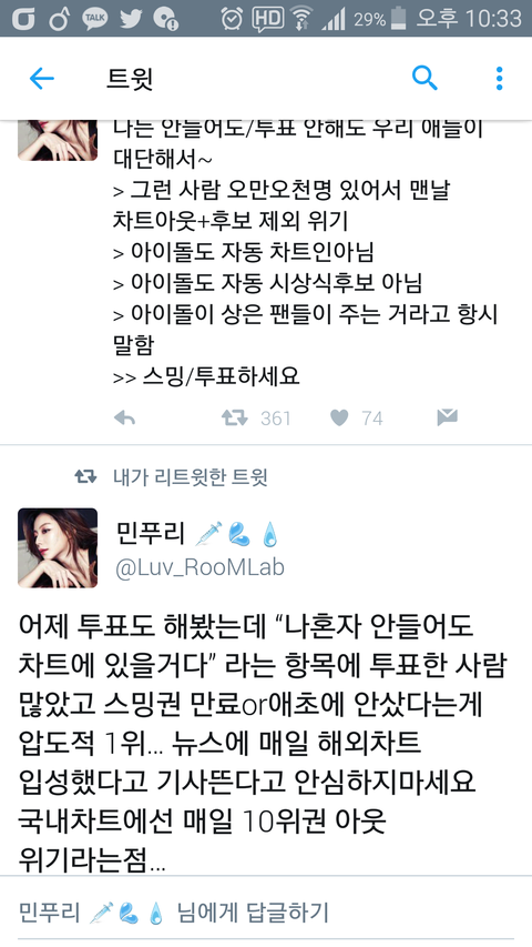 그럴꺼면 탈덕해 그냥ㅋㅋㅋㅋ말투 둥글게 못해 너네한테는ㅋㅋㅋㅋ받을 줄 알면 주는법도 알아야지 뭐하는거냐 진짜?계속 이렇게 하면 대상은 무슨 나머지 상들은 꿈도 못꿔 팬이 많으면 뭐해 고생고생해서 만든 곡들이 헛되게 생겼는데