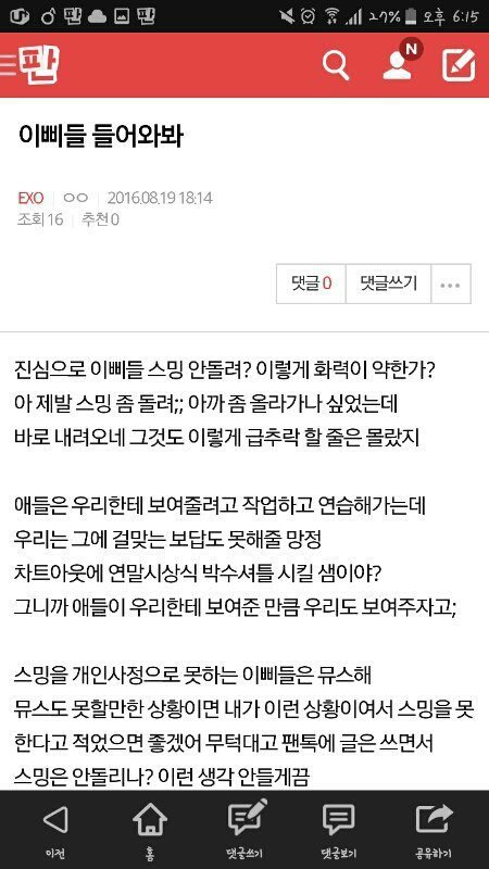 또한 허브홈에서 다른 가수에 대한 험담글을 올리고 맞장구 치며 공감한다는 댓글을 다는 행동도 웃기네요. 허브홈이 험담 커뮤니티인가요? 저라면 그럴 시간에 응원하는 가수 사진을 한 번 더 보고 영상을 한 번 더 봤을 것 같습니다. 좋게 응원할 수 있는 방법이 많은데 꼭 수많은 다른 가수분들을 끌어내리며 응원하셔야했는지 의문이 드네요.