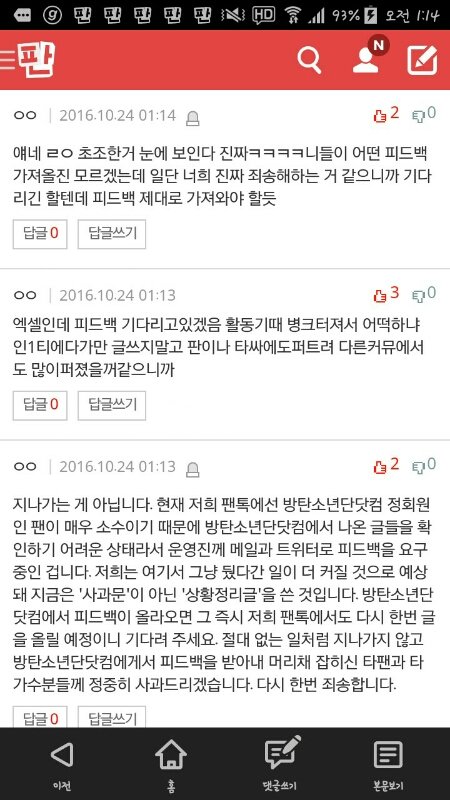 중간에있는거 ㅇㅇ이분말처럼 다른커뮤에도 내일아침쯤이면 엄청 퍼졌을꺼야 어디에든 글올라오면 빠르게 글퍼트려야돼 우리화력이 그만큼 중요하고 베댓선점도 잘해야돼 많이힘들지 멘탈잘잡고 피드백요청계속하자