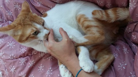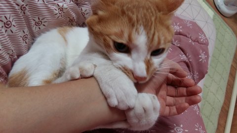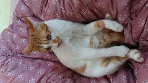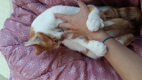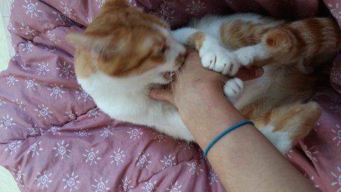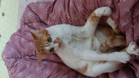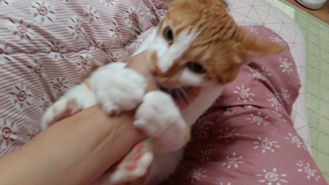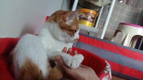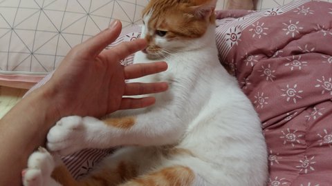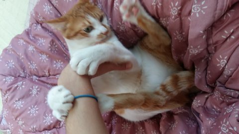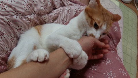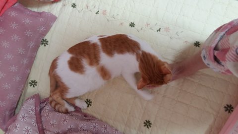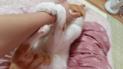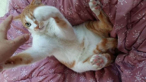 장난감 들기 귀찮아서 도칠이 이불에 눕히고 손으로 놀아줌.