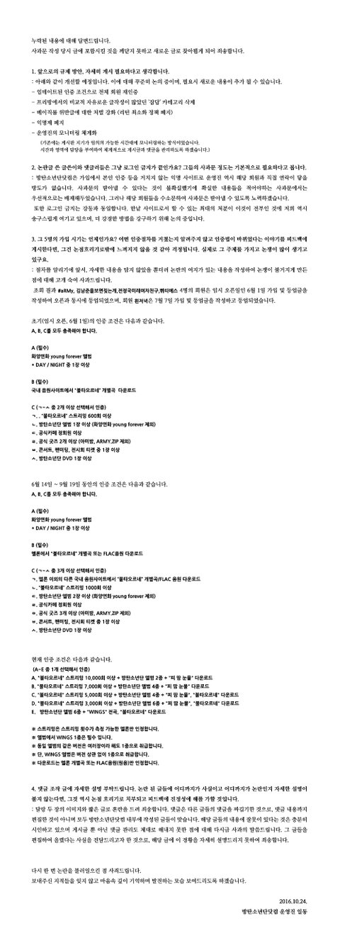 방탄소년단닷컴(이하 방닷)에서 공개한 글 작성한 회원들의 등업 시기를 보니 현재와 달리 등업조건이 낮았던 홈 임시오픈일날 가입했던 회원들로 확인되었습니다. 그러나 등업조건이 낮았다 하여 이들이 했던 행동을 어그로나 라이트팬이 했다고 볼 수 없음을 잘 알고 있습니다. 같은 아미로서 그들이 했던 행동에 대해 부끄러움을 느끼고 상처받으신 타팬덤 여러분께 죄송하다는 말씀 드리고 싶습니다.