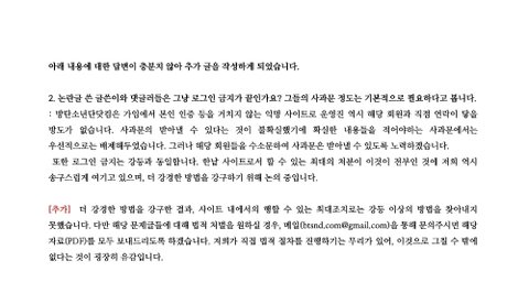 방닷측은 두 번 다시 이런 일이 생기지 않도록 현재 등업 조건을 기준으로 모든 회원 재인증 절차를 거칠 것, 익명제 폐지, 관리자 모니터링 체계 강화(시간&구역을 나누어 따로 담당 예정), 해당 글에 대한 법적 처벌을 원하실 경우 메일을 통해 문의를 해 주신다면 PDF 자료를 모두 보내드릴 것을 약속하였습니다.