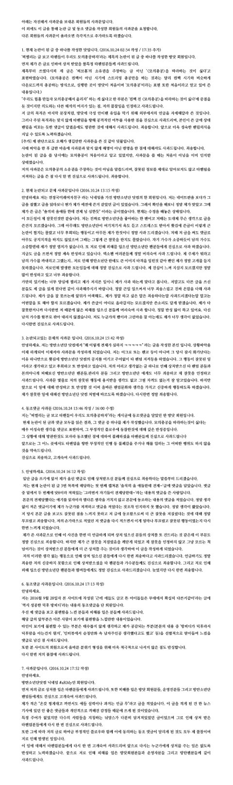문제가 된 글들에 대한 회원 사과문 및 방탄소년단 닷컴의 공식 피드백입니다.